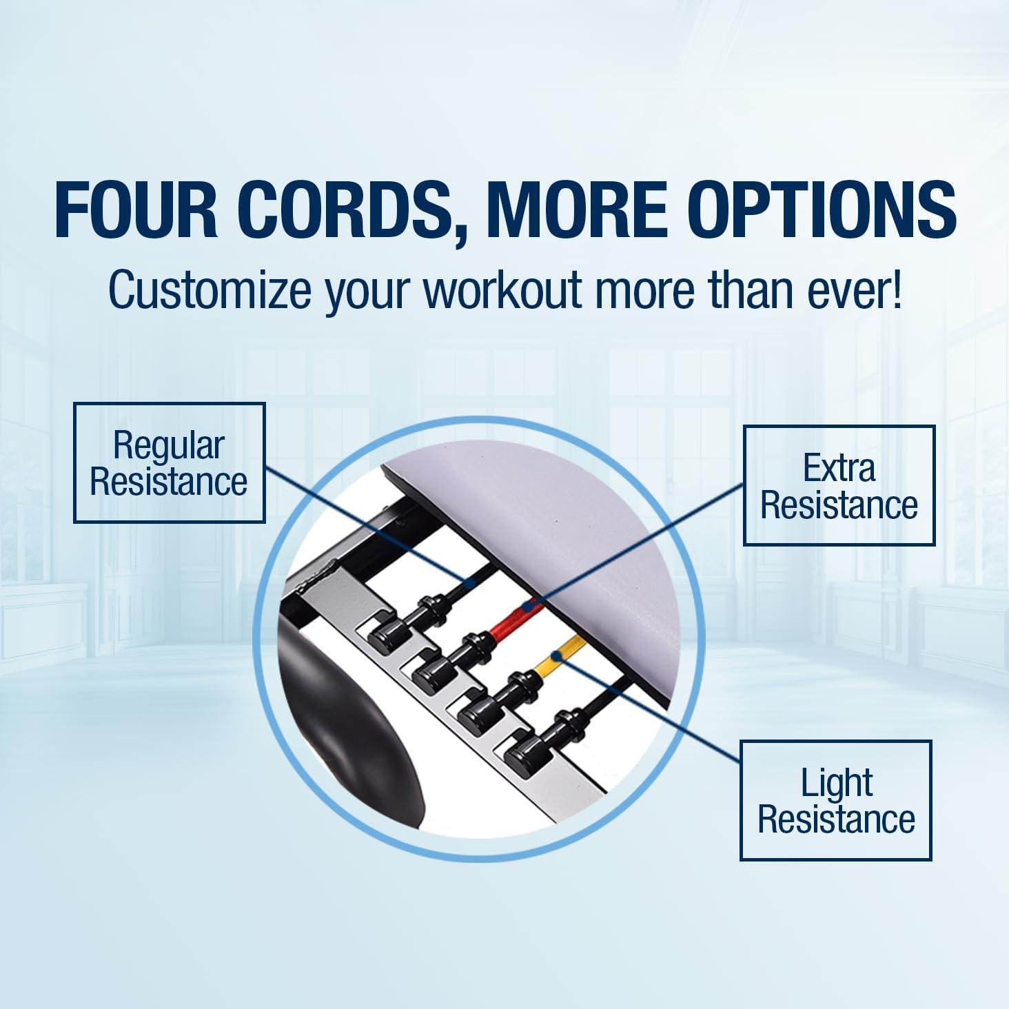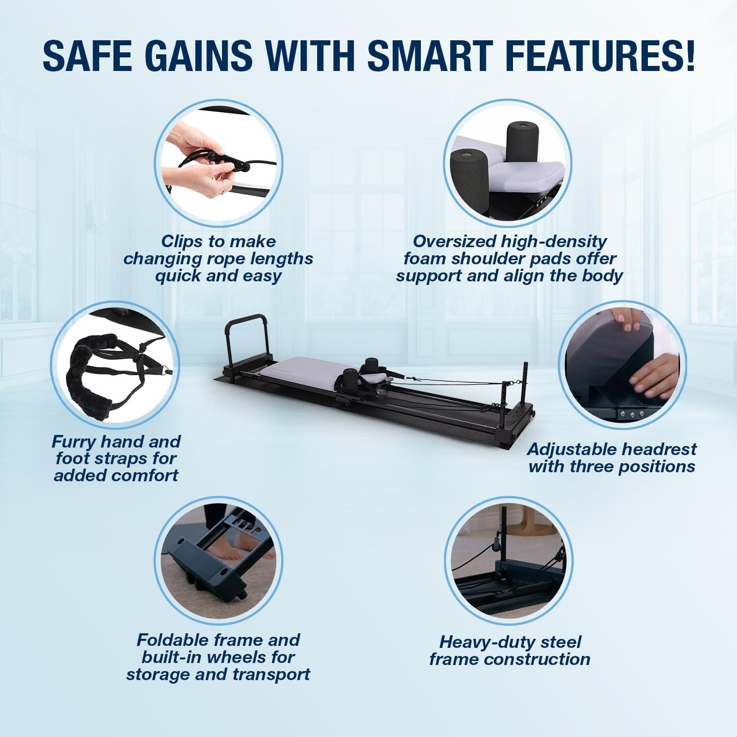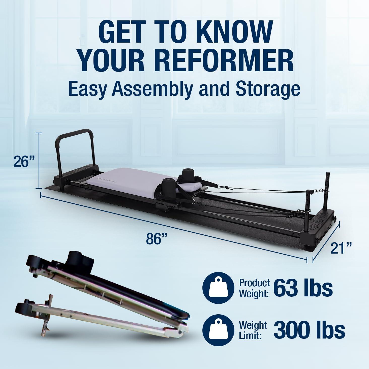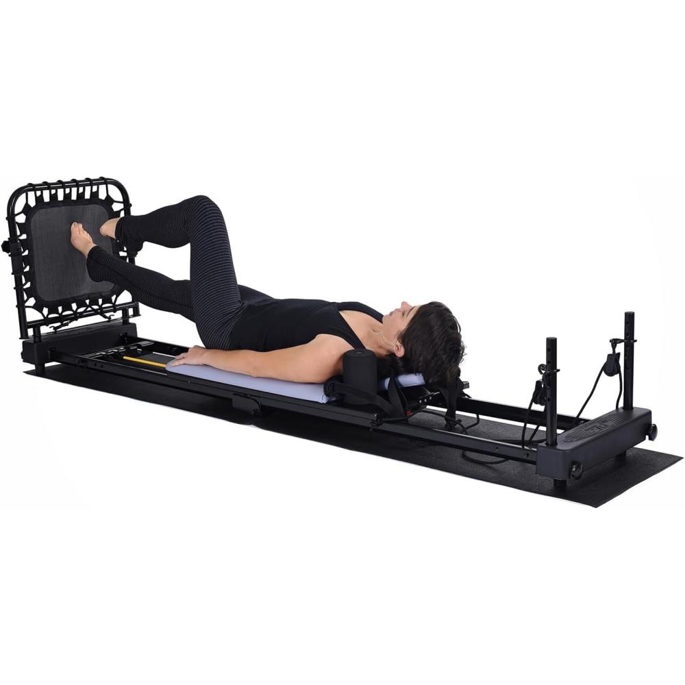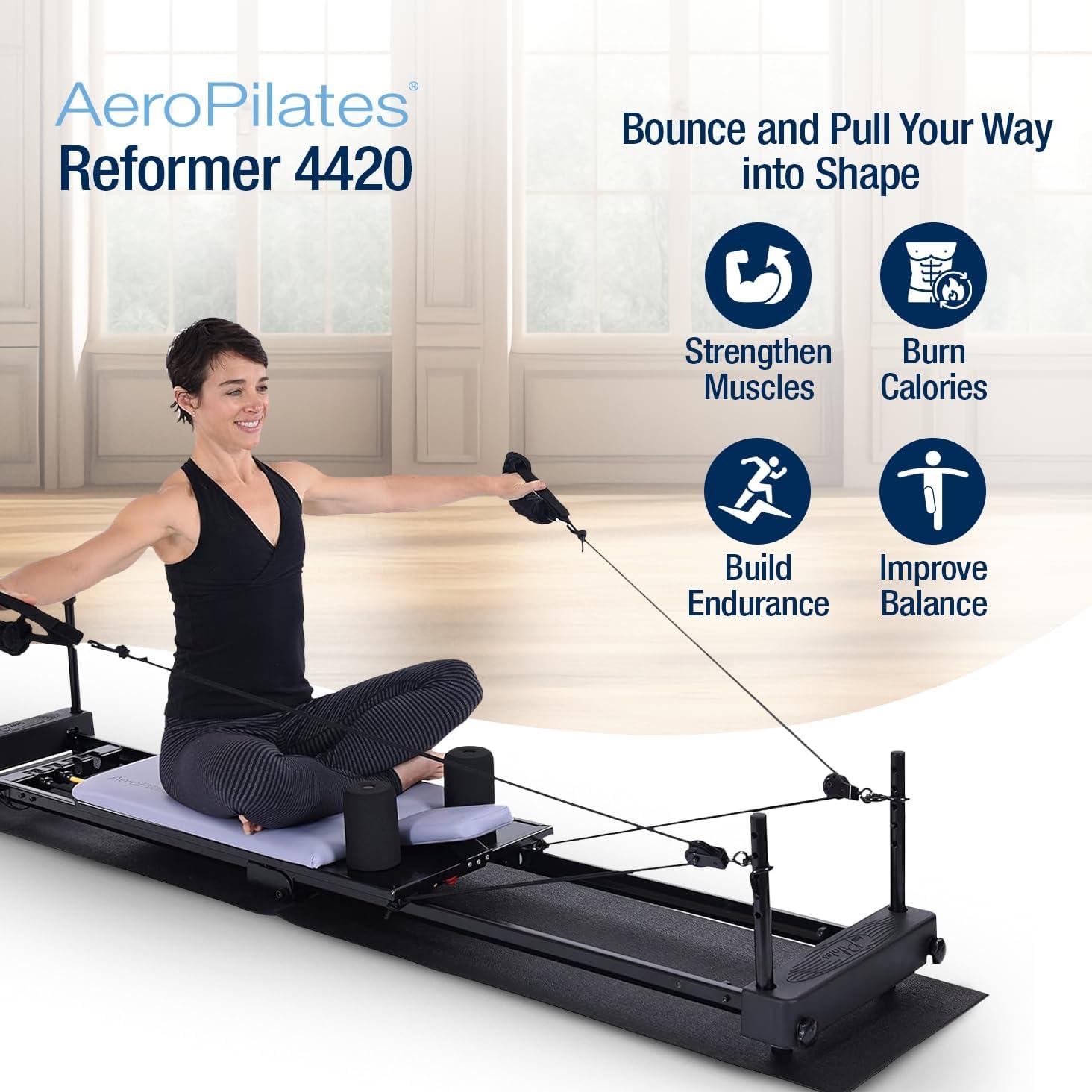 Introducing the Aero Pilates Reformer 4420: your ultimate home pilates board workout that blends strength, cardio, and flexibility in one sleek, space-saving package. With four cords—two black regular resistance cords, one red extra resistance cord, and one yellow light resistance cord—this reformer pilates machine offers unparalleled customization for your workouts, allowing you to target and tone your entire body with ease. The upgraded pulley system is smooth and adjustable, making your arm and leg sessions enjoyable. Ready to elevate your AeroPilates game? Swap the padded foot bar for the patented Cardio Rebounder to bounce and pull your way into shape. The Rebounder’s low-impact design allows you to torch calories, strengthen your core, and tone your legs with varying resistance levels—lighter resistance for abs and heavier resistance for calves, hamstrings, and quadriceps. Stay motivated with four new pilates reformer foldable workout DVDs—Primer, Basic, Stretching, and Fat Burning Cardio—designed to guide you from beginner to pro. Also included is the equipment mat that protects your floors and your reformer, and completes the look of your AeroPilates Reformer 4420. Plus, the included wall chart helps you build your personalized routine. Packed with innovative features like furry hand and foot straps, oversized high-density foam shoulder pads, an adjustable three-position headrest, and quick-change rope clips, the AeroPilates Reformer 4420 portable pilates reformer is designed for comfort and performance. Its foldable frame and built-in wheels make storage a breeze, so you can bring the benefits of Pilates to your home without the bulk. Our foldable pilates accessories machines are the affordable, space-saving solution to bring the studio experience right to your living room. With multiple resistance levels, guided videos, and versatile accessories, AeroPilates pilates at home equipment lets you move, fold, and flow your way to a stronger you—no gymrequired