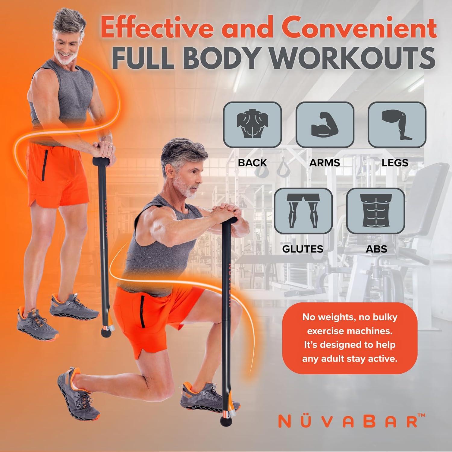 The Nüvabar is the easy, yet effective way to exercise for everyone struggling with loss of strength and tight muscles and joints. The NüvaBar and its low-impact workouts help improve balance, strength, flexibility, circulation and free-up stiff joints.