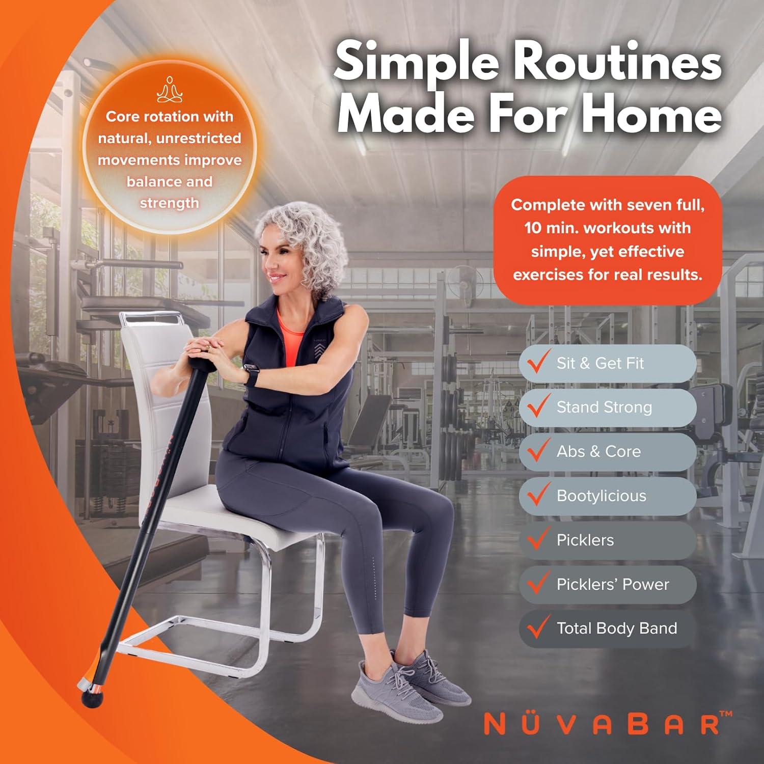 NüvaBar is your premium, budget-friendly exercise equipment, complete with seven workouts that will keep you motivated and moving: Sit & Get Fit, Stand Strong, Abs & Core, Bootylicious, Picklers, Picklers’ Power, and Total Body Band!