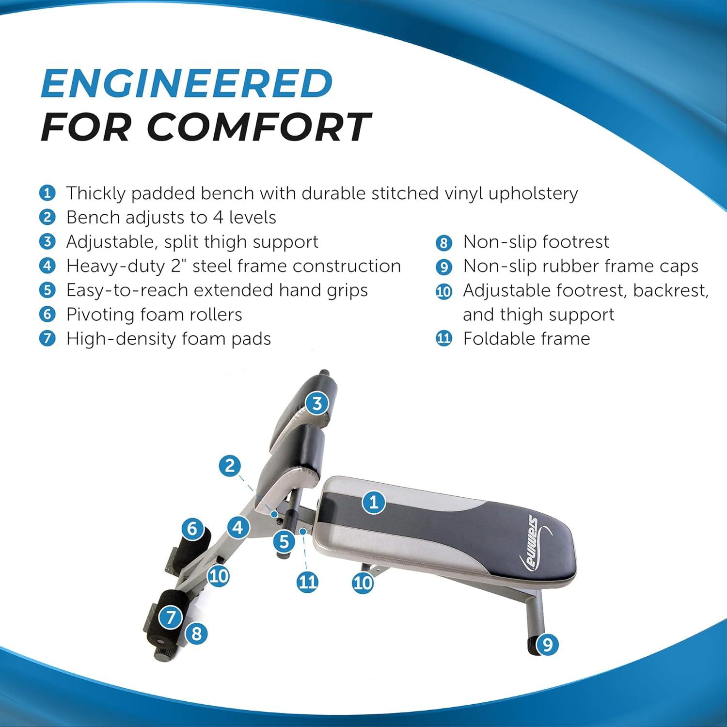 SPACE SAVING DESIGN – This compact and foldable sit up bench is designed for easy storage and is ideal for users with limited space. Our exercise bench provides complete high-quality upper and lower body workouts in the comfort of your home.