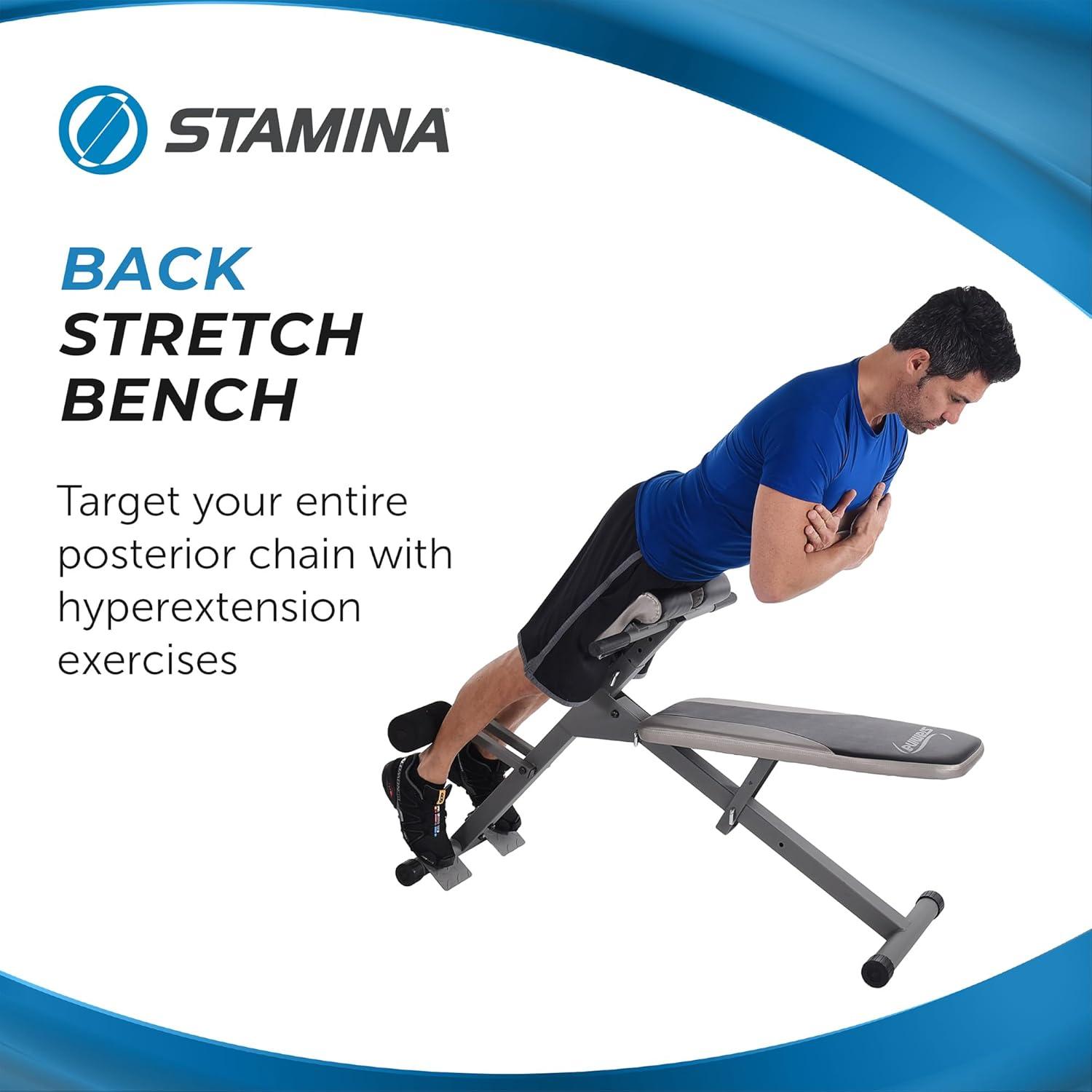 The Stamina Ab/Hyper Bench gives you terrific core strength and powerful back muscles. Work your upper and middle abs in four crunch positions ranging from flat to a 30 degree decline. The pull of a pin quickly and easily adjusts the angle of the bench to adjust your workout intensity.