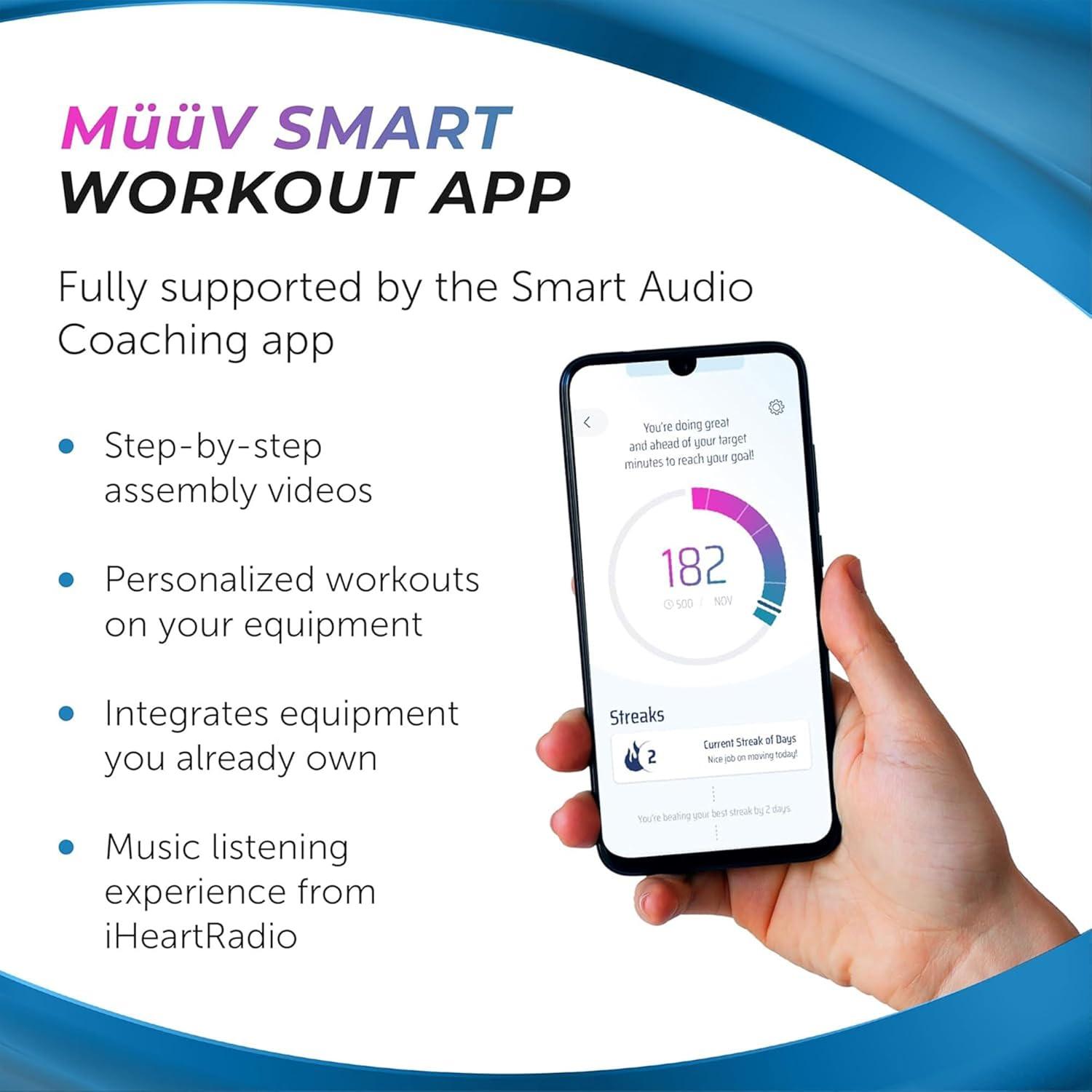 Row Glider: Full range of motion, padded rowing arms for strengthening upper body with push-off to engage lower body; müüv App provides personalized workouts and music