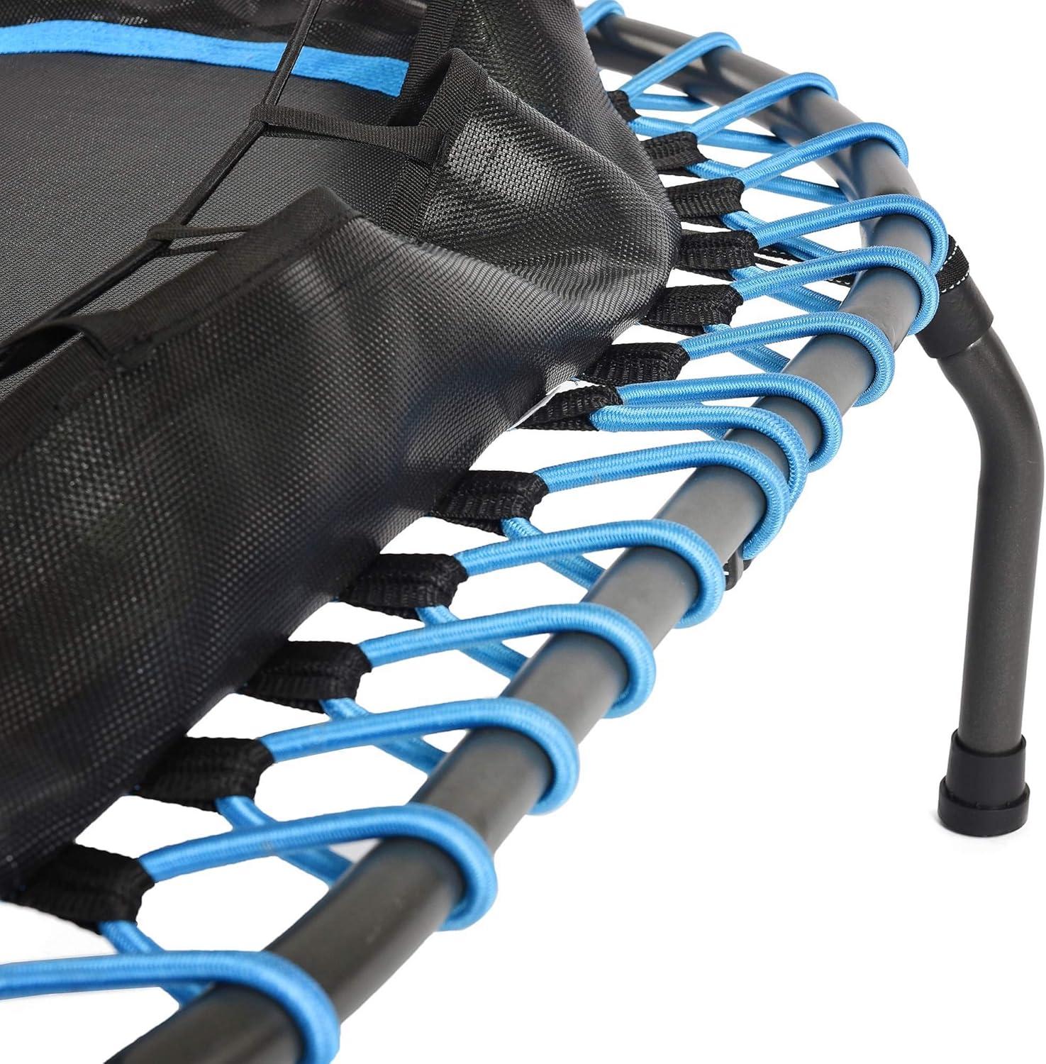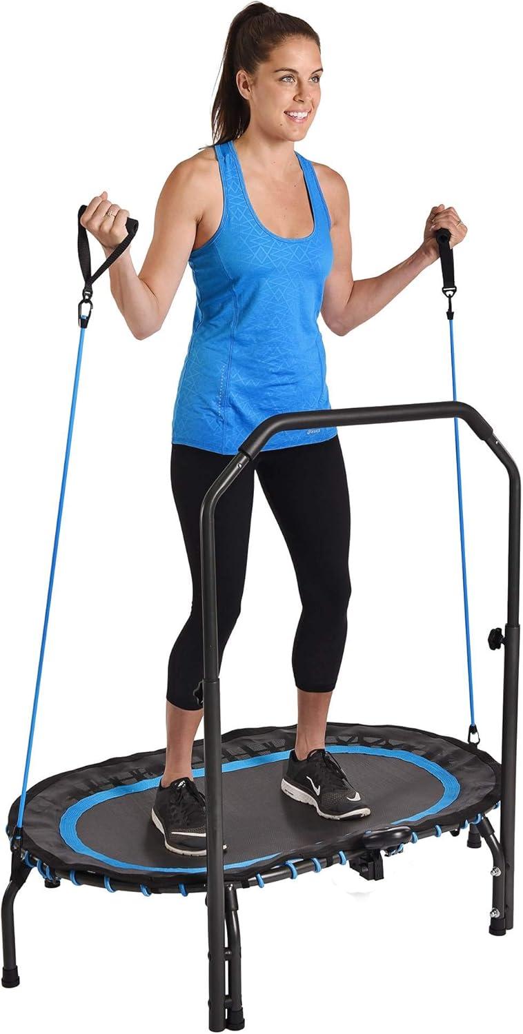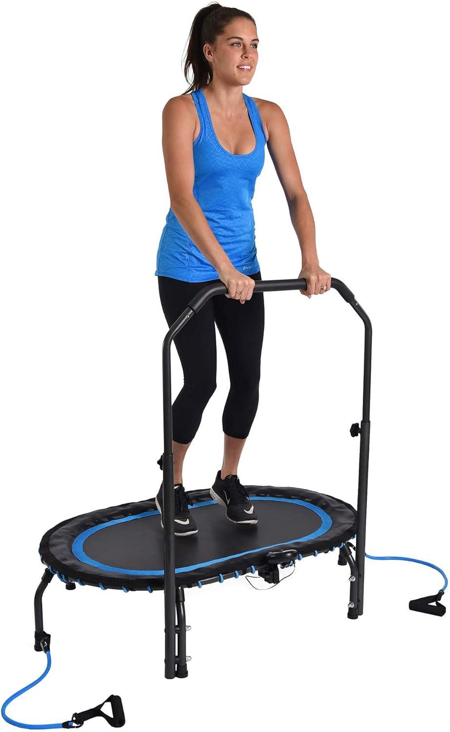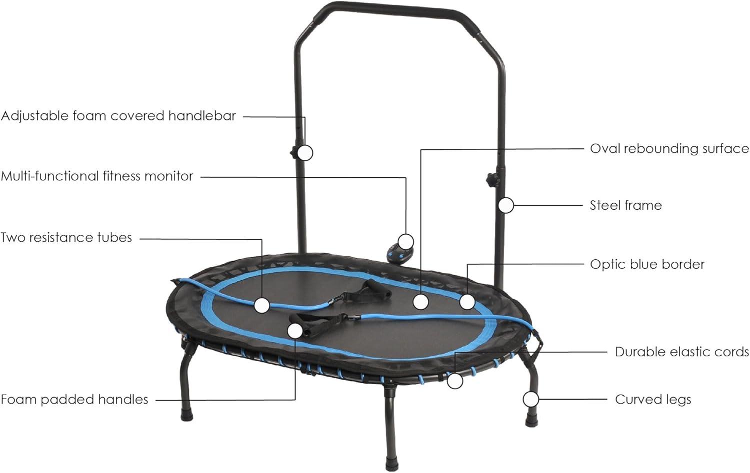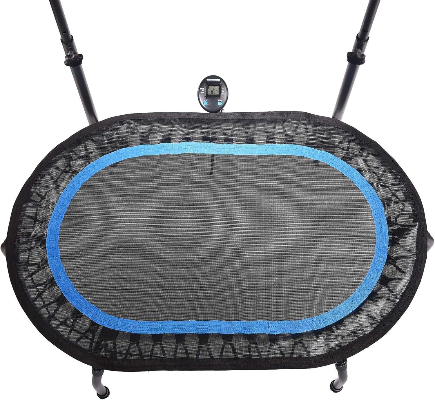 Rebounding is one of the best ways to get a calorie-burning, endurance-building workout without impact. With the Stamina Oval Fitness Trampoline, it's now more fun and effective than ever. The oval rebounding surface provides more stability than regular trampolines. Plus, the wider surface allows for more varied workouts. The safety pad will also keep you off the elastic bands. And with the trampoline's optic blue border, you'll always be jumping in the best spot. It offers complimentary access to the müüv app, an innovative audio coaching app encouraging you to achieve 500-plus minutes of balanced exercise each month. The app provides personalized, progressive, enjoyable coaching, a follow-along assembly video, equipment-specific workouts, and ad-free music from iHeartRadio. You can download the müüv app from the Apple Store or Google Play Store. Unlike a treadmill or sizeable elliptical machine, the Stamina Oval Fitness Trampoline only takes up a 45-inch by 33-inch area on the ground. You can use and move it as much as you like. But just because it's small doesn't mean it's not sturdy. The trampoline can support up to 250 pounds. And when you have a way to exercise at home, it's hard to find excuses. With nutritious foods and consistent use, you'll start to see results. Make fitness fun and practical with us today, and bounce your way to improved well-being with the Stamina Oval Fitness Trampoline.