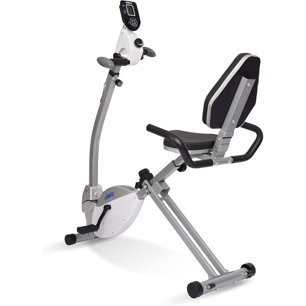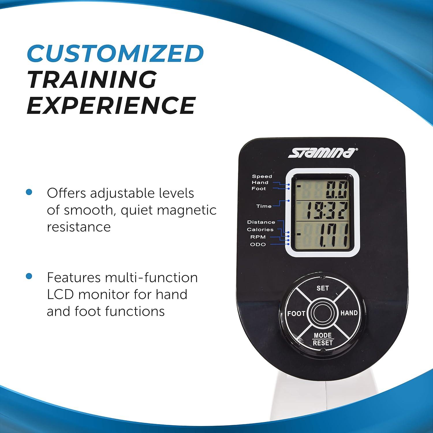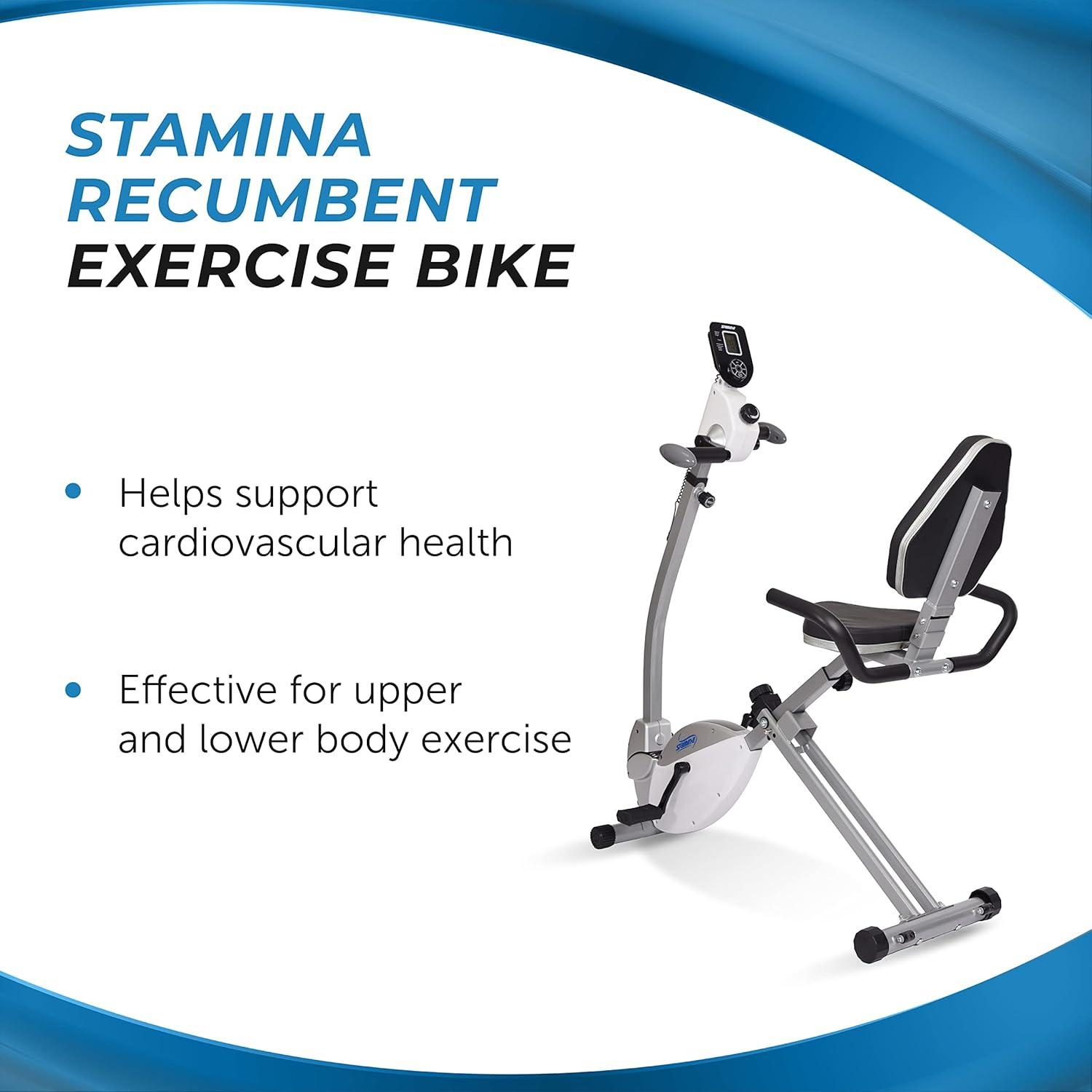 The Stamina Recumbent Exercise Bike with Upper Body Exerciser lets you have the best of both worlds. Our recumbent exercise bike provides effective, efficient cardio and muscle-toning workout. The built-in upper hand pedals offer multiple grip positions for the upper body to engage the back, arms, shoulders, chest and core. This exercise bike provides an ergonomic, relaxed sitting position that’s easier on your back. The low step-through design allows a safe way to get on and off the fitness bike for an enhanced comfort and stability. This comfortable, quiet bike utilizes magnetic resistance, so it won’t disturb you or others. This workout bike offers 8 levels of magnetic resistance for the lower body and adjustable tension dial resistance for the upper body. Experience total body workout and boost your cardiovascular endurance with this recumbent exercise bike. This exercise bike for seniors includes textured pedals, padded hand grips, ergonomic handlebars, and an extra-large cushioned, upholstered seat and backrest for maximum comfort. Even more, the multiple height and seat adjustment knobs make customizing the fit of your exercise bike easier than ever. There's even an easy-adjust lever that controls the tilt of the upper body pedals that you can control with your right foot. CONVENIENT SMART WORKOUT APP- This home gym equipment is fully supported by müüv, the all-in-one app that provides smart guided audio coaching, follow-along assembly videos, and personalized workouts, and helps you move 500+ minutes per month with the right mix of cardio, strength, and flexibility for a healthy and sustainable lifestyle. The all-in-one app comes with a follow-along assembly video, personalized workouts tailored to your strength training equipment, and an ad-free music listening experience from iHeartRadio. Download the müüv app on the Apple App Store or the Google Play store. Providing you with the best workout and fitness experience, get visible results, and track your progress with Stamina.